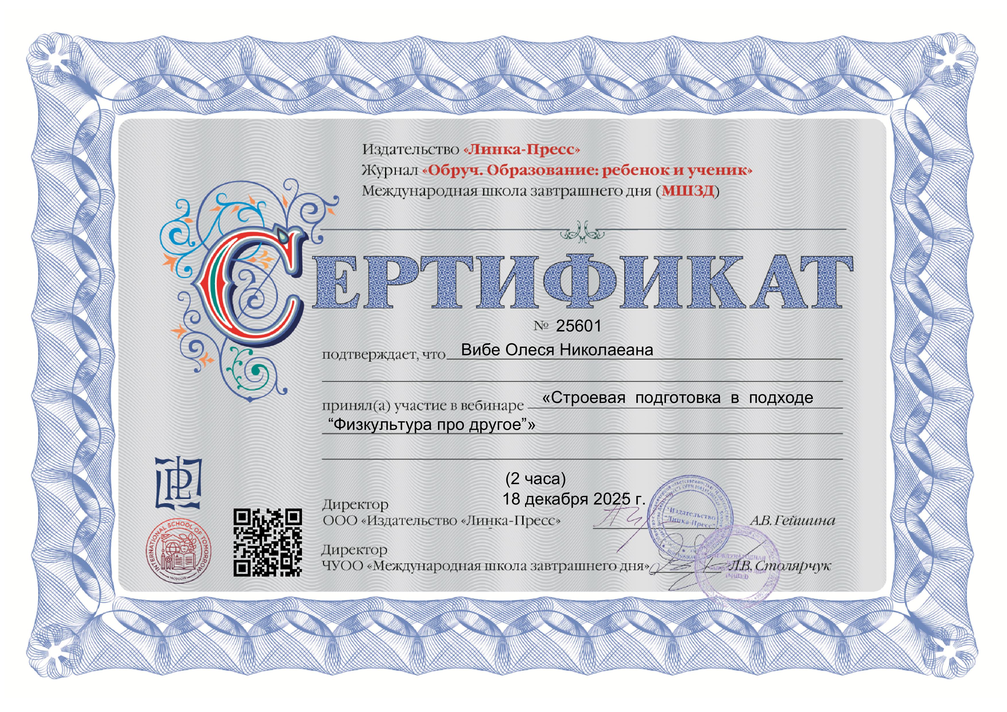 Сертификат участника вебинара "Строевая подготовка в подходе "Физкультура это про другое"", 2025 г.