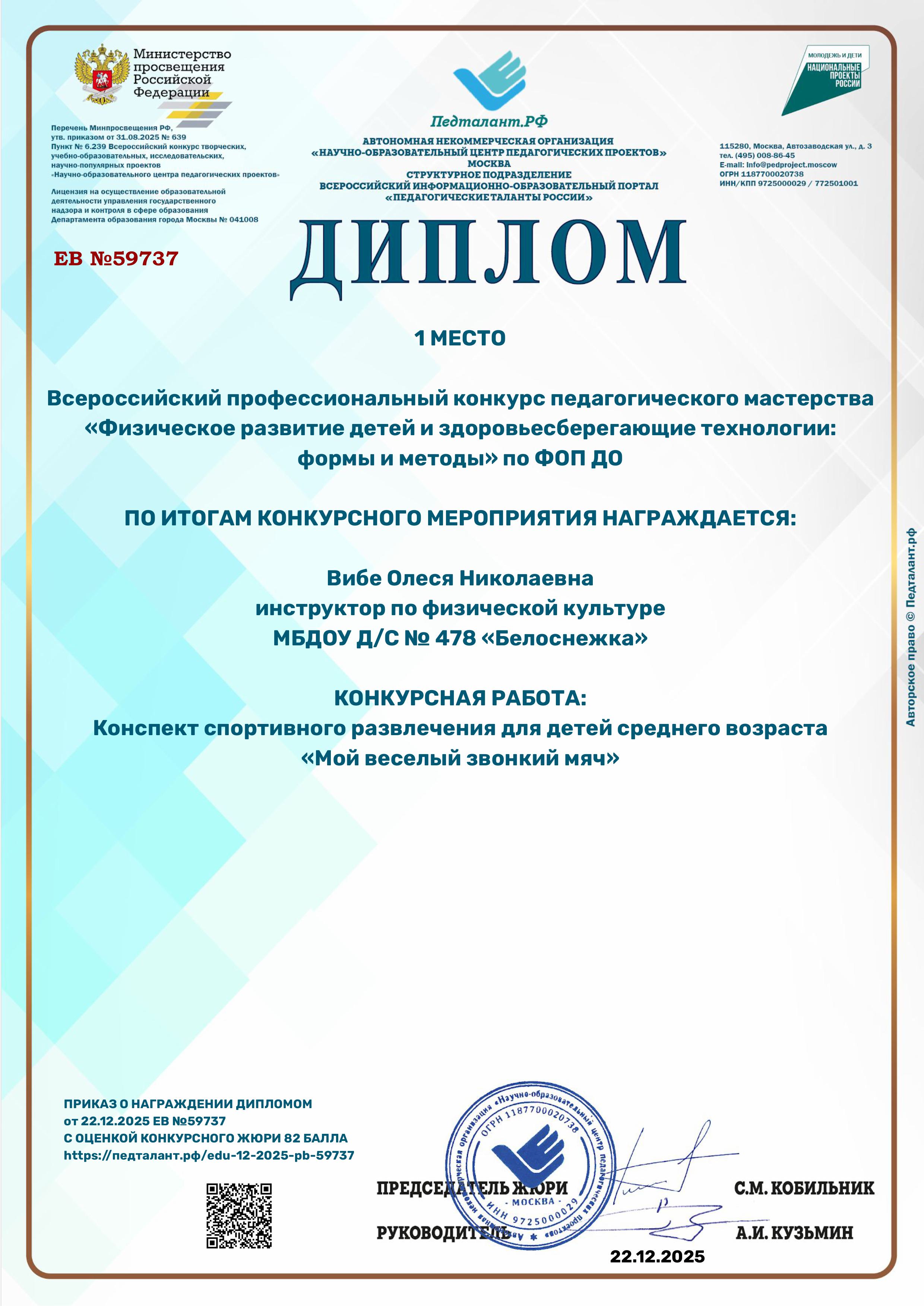 Диплом 1 степени во всероссийском конкурсе "Физическое развитие детей и здоровьесберегающие технологии: формы и методы", 2025 г.