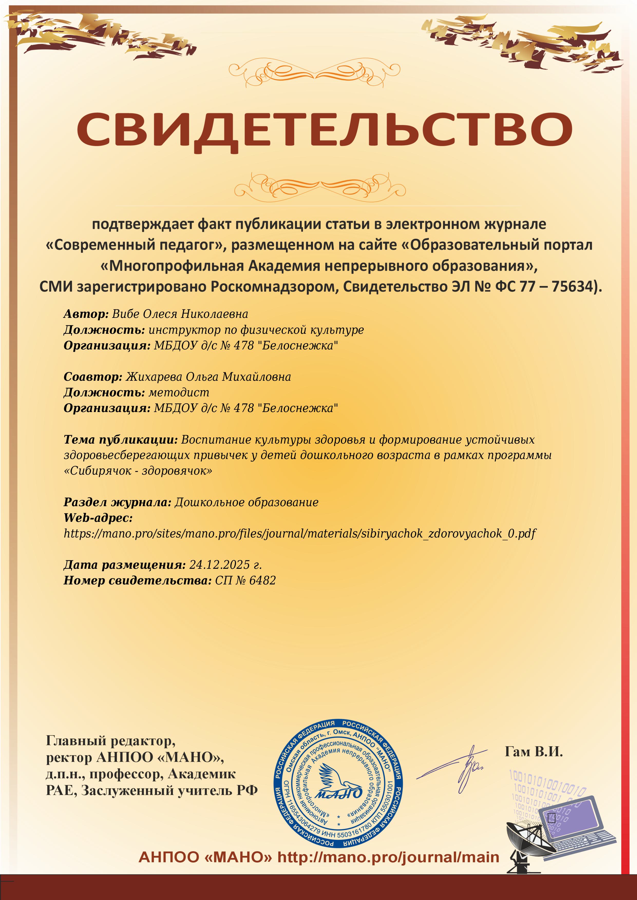 в рамках программы «Сибирячок - здоровячок» в электронном журнале "Современный педагог", 2025 г.