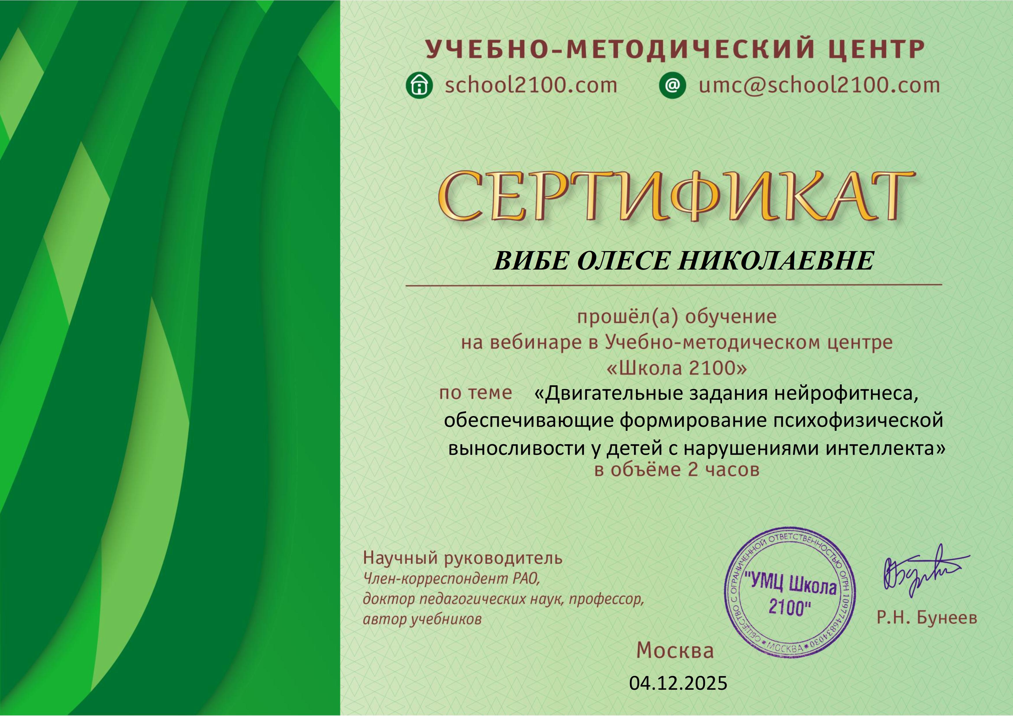 Сертификат участника семинара "Двигательные задания нейрофитнеса, обеспечивающие формирование психофизической выносливости у детей с нарушением интеллекта"