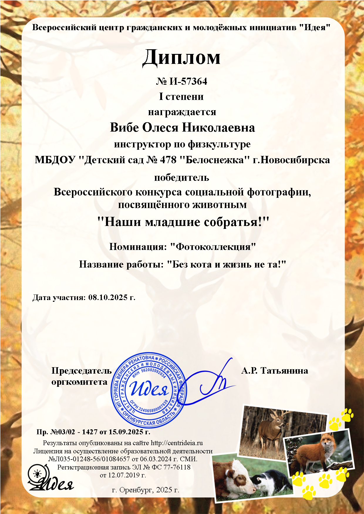 Диплом 1 степени Всероссийского конкурса социальной фотографии посвященный животным "Наши младшие собратья"